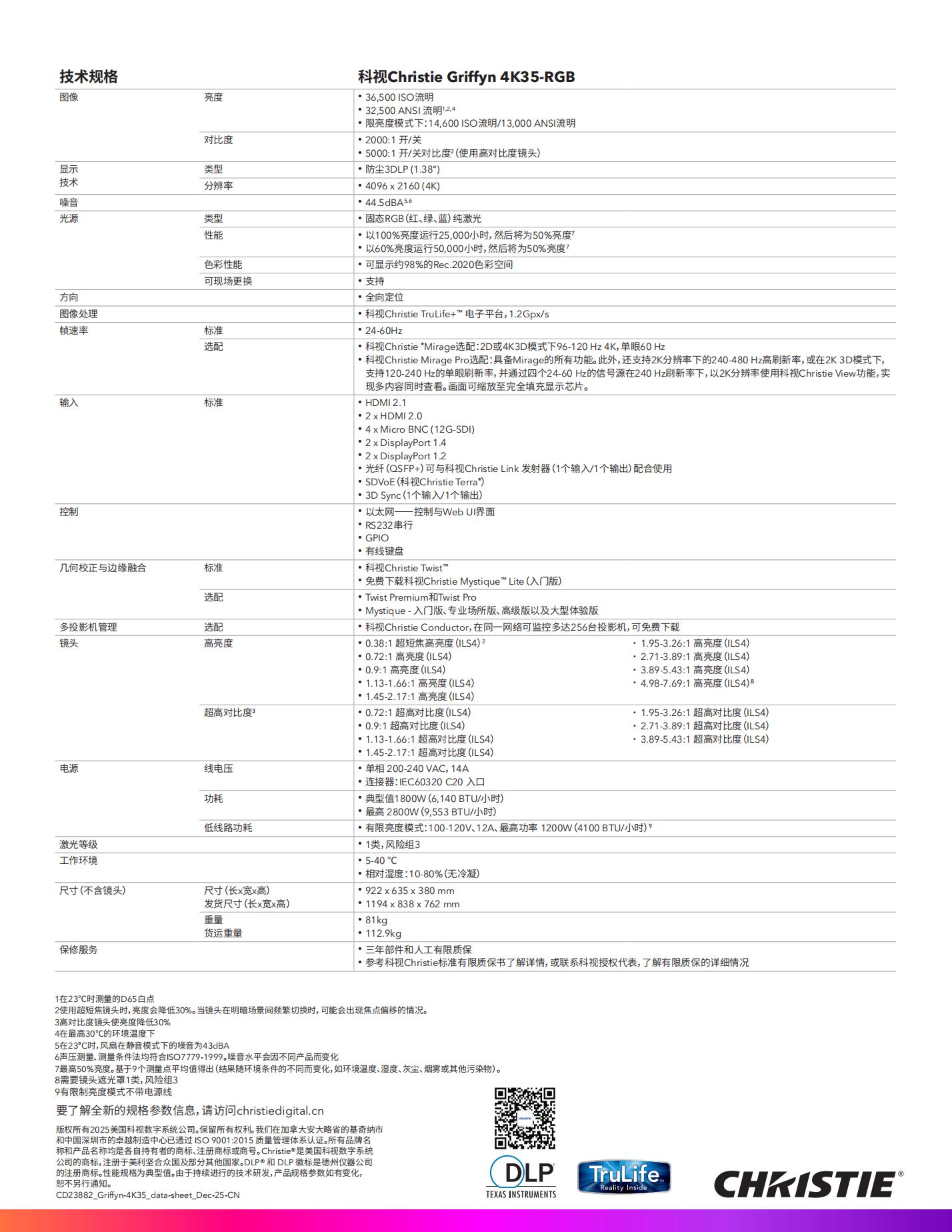 4K 镜头兼容性 兼容所有科视Christie® 3DLP®4K ILS4 镜头